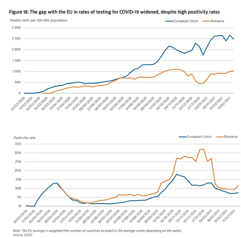 Acesta mai arată că „de la mijlocul lunii martie, România a adoptat protocoalele de testare ale Centrului European de Prevenire și Control al Bolilor (European Centre for Disease Prevention and Control - ECDC). Au avut prioritate la testare rezidenții și angajații din sistemul de asistență socială, iar din octombrie 2020, au fost introduse testări obligatorii săptămânale pentru cei din centrele rezidențiale. Capacitatea de testare a crescut de la un singur centru în februarie la 57 de centre în iulie 2020 și la 176 până la sfîrșitul lui ianuarie 2021. Cu toate acestea, capacitatea de testare a rămas redusă în raport cu cererea și România a avut o rată de testare mai mică decât media UE, mai ales în timpul valurilor din toamnă și iarnă.