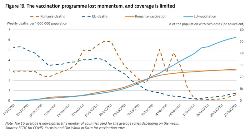 Raportul UE despre starea sănătății în România vorbește și despre campania de vaccinare anti-COVID, reținând că aceasta „a început bine în România, prioritizând personalul medical și din centrele rezidențiale, înainte să treacă la populația la risc (oameni în vîrstă, pacienți cronici și persoane cu dizabilități) și apoi la populația generală. Campania a demarat în decembrie 2020, fiind implementată o strategie de comunicare a Guvernului. A fost creat un site oficial care să ofere informații despre vaccin, efecte adverse și beneficii, mituri și fapte. De proces s-au ocupat Ministerul Sănătății, Ministerul Apărării Naționale, Ministerul Afacerilor Interne. (...) În ciuda acestui început rapid, rata de vaccinare a scăzut cu 20 la sută când populația a început administrarea celei de-a doua doze. Este nevoie de îmbunătățirea logisticii în comunitățile rurale, dar se observă și o ezitare și o rezistență la vaccinare care trebuie învinse”.