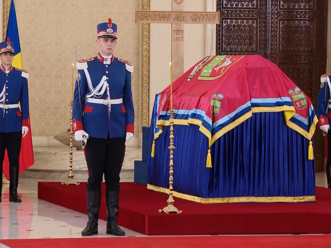 La catafalc s-au recules descendenți ai domnitorului și consilieri ai președintelui Nicușor Dan, care se aflau în sala Unirii în momentul sosirii sicriului.