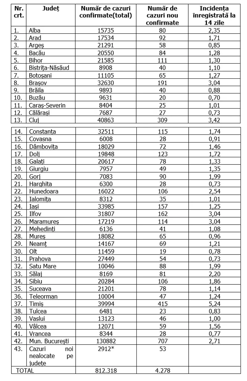 În ceea ce privește cazurile noi depistate în ultimele 24 de ore, situația arată astfel: