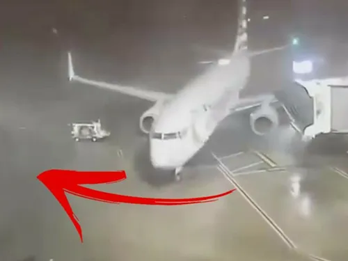 Avionul a fost împins de rafale de vânt în timp ce era legat la o poartă de îmbarcare, în timpul unei furtuni pe aeroport.
