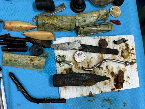 Medicii l-au internat de urgență pe Secția Chirurgie IV pentru o plagă penetrantă în abdomen, dar șocul a apărut în momentul în care au văzut ce conținea stomacul bărbatului: bancnote de un leu rulate și înghițite, obiecte de metal, de cauciuc, de plastic, inclusiv ceva ce pare a fi partea metalică a unui ciocan, o lamă de cuțit și două piroane ascuțite, scrie Ziarul de Iași.
