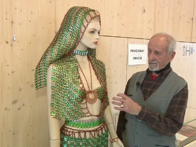 Un bunic din Slovenia își folosește imaginația și îndemânarea pentru a crea ținute și accesorii din capace metalice.