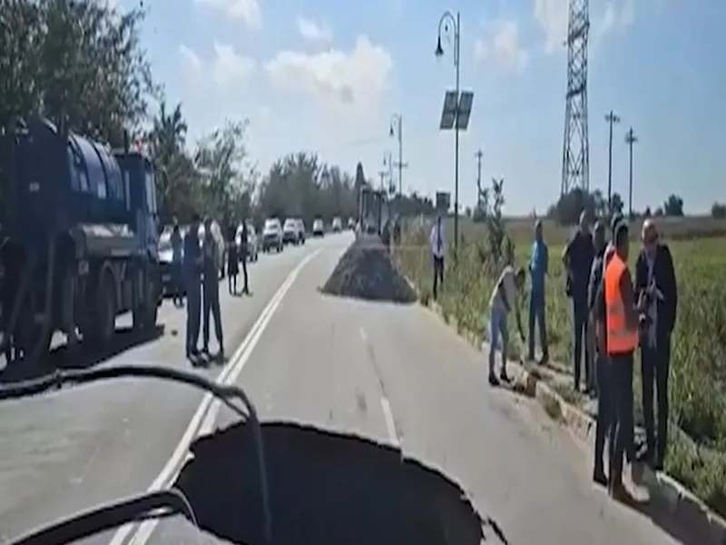Situație critică pe drumul dintre Năvodari și Lumina! Un crater uriaș s-a format în asfalt iar traficul a fost complet blocat.
