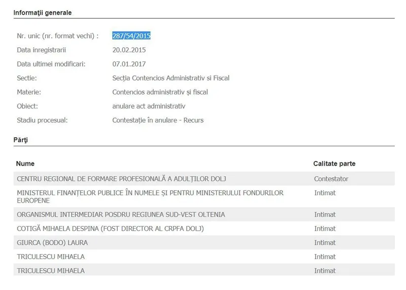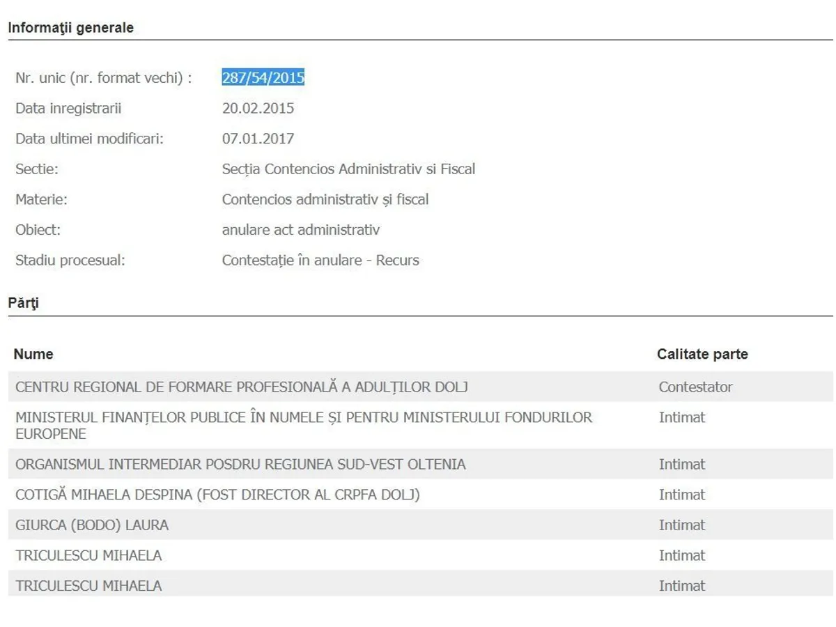 Raportul ANI a fost contestat de fosta directoare. În februarie 2013, Curtea de Apel Craiova a respins contestația Mihaelei Cotigă, iar hotărârea instanței a fost atacată cu recurs. În decembrie anul trecut, Curtea Supremă a admis recursul Mihaelei Cotigă și a dispus ca instanța din Craiova să rejudece contestația. În prezent, dosarul se afă pe rolul Curții de Apel Craiova.
