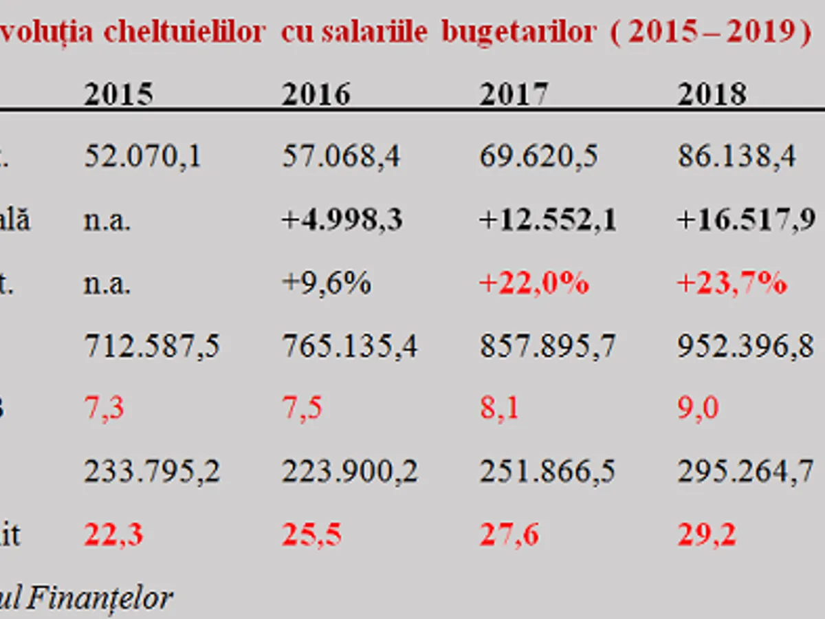 Majorarea de 97% a sumelor alocate pentru salariile bugetarilor a fost dublă în raport cu creșterea de 49% a PIB în același interval de timp.