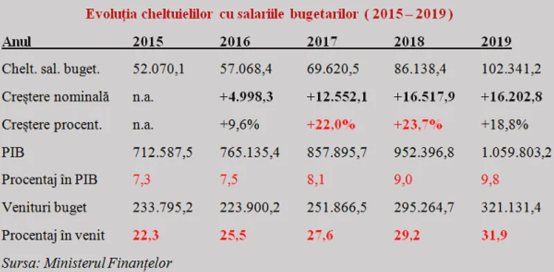 De la circa 52 miliarde de lei în anul 2015, s-a ajuns în 2019 la depășirea semnificativă a pragului de 100 de miliarde de lei. Totodată, ponderea în PIB a sumelor destinate angajaților statului a urcat de la 7,3% la 9,8%.