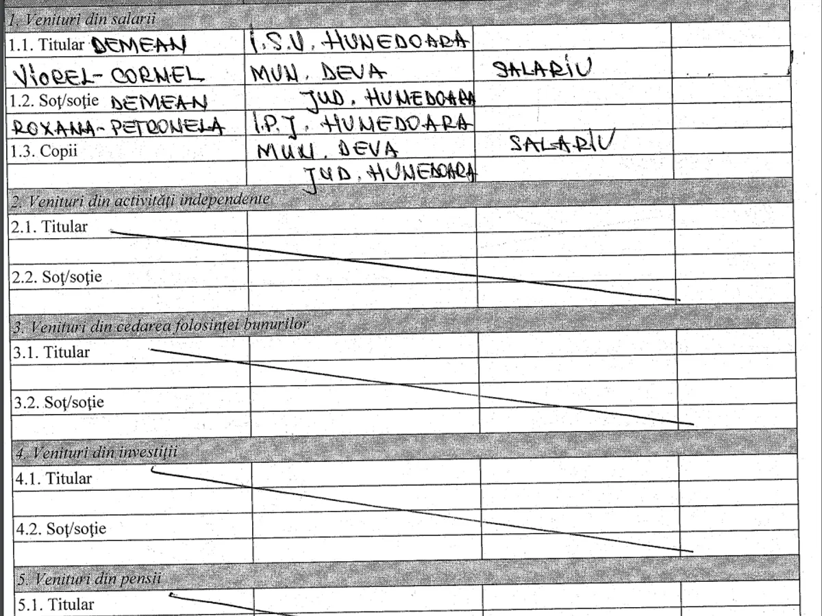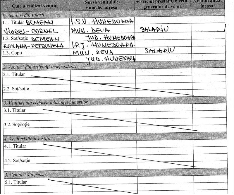 Mai mult, în declarația de avere pe anul trecut, Demean a omis să treacă ce salariu anual a obținut de pe urma ocupării funcției de șef al ISU, ca de altfel nici pe cel al soției, angajată a Inspectoratului Județean de Poliție (IPJ) Hunedoara.