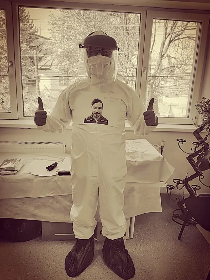 Un medic cardiolog din Timișoara și-a lipit forografia de combinezonul de protecție pentru care pacienții cu COVID- 19 pe care-i tratează să-i poată vedea chipul.
