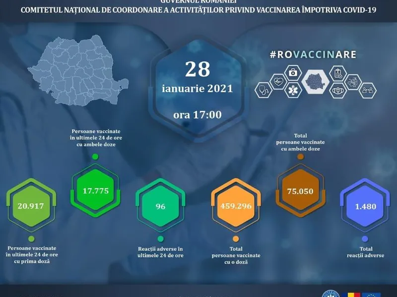 Potrivit CNCAV, din datele puse la dispoziţie de către Institutul Naţional de Sănătate Publică, prin aplicaţia Registrul Electronic Naţional al Vaccinărilor (RENV), care ţine evidenţa vaccinărilor, reiese că în ultimele 24 de ore au fost administrate 38.692 de doze de vaccin împotriva COVID-19 Pfizer BioNTech, la un număr de 38.692 persoane, din care: 20.917 persoane vaccinate cu 1 doză; 17.775 persoane vaccinate cu 2 doze.
