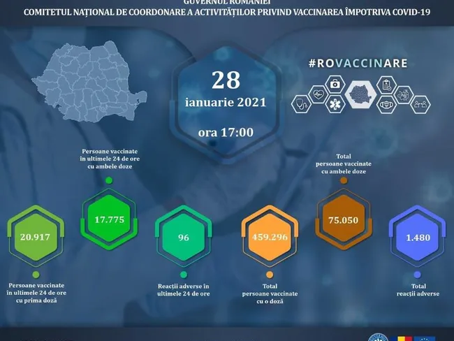 Numărul total de reacţii adverse înregistrate la nivelul centrelor de vaccinare, începând din 27 decembrie, este de 1.480 reacţii comune şi minore, din care: 418 reacţii de tip local cu durere la locul injectării; 1.062 reacţii generale (febră, cefalee, mialgii, artralgii, astenie, alergii de tip urticarie).