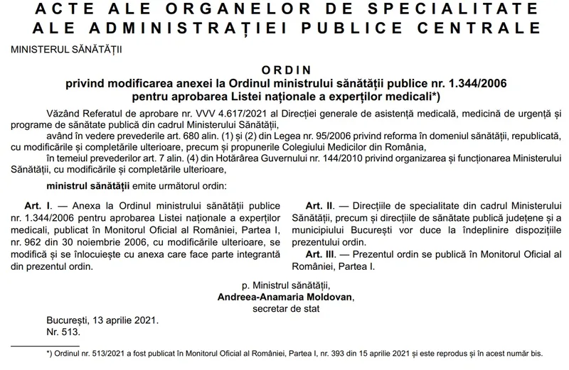 Ordinul a fost publicat în Monitorul Oficial în 15 aprilie și se referă la aprobarea Listei naționale a experților medicali.