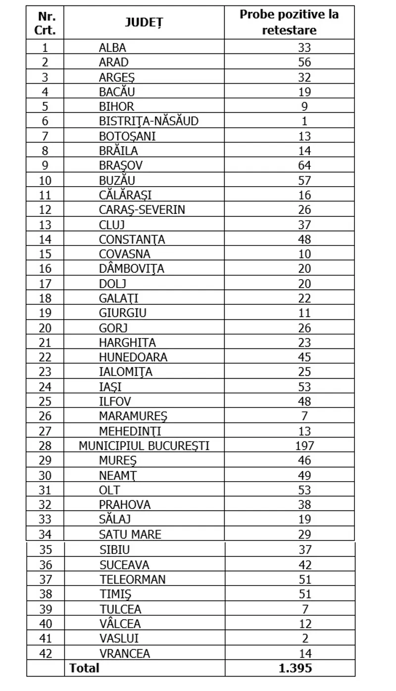 Distinct de cazurile nou confirmate, în urma retestării pacienților care erau deja pozitivi, 1.395 de persoane au fost reconfirmate pozitiv. Distribuția pe județe a acestor cazuri o regăsiți în tabelul de mai jos: