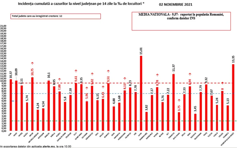 Coeficientul infectărilor cumulate la 14 zile, raportate la 1.000 de locuitori este calculat de către Direcțiile de Sănătate Publică, la nivelul Municipiului București și al județelor. Mai jos aveți graficul realizat în baza raportărilor primite de CNCCI de la Direcțiile de Sănătate Publică: