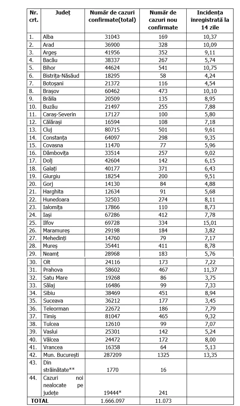 Distribuția pe județe a cazurilor per total și a celor noi o regăsiți în tabelul de mai jos: