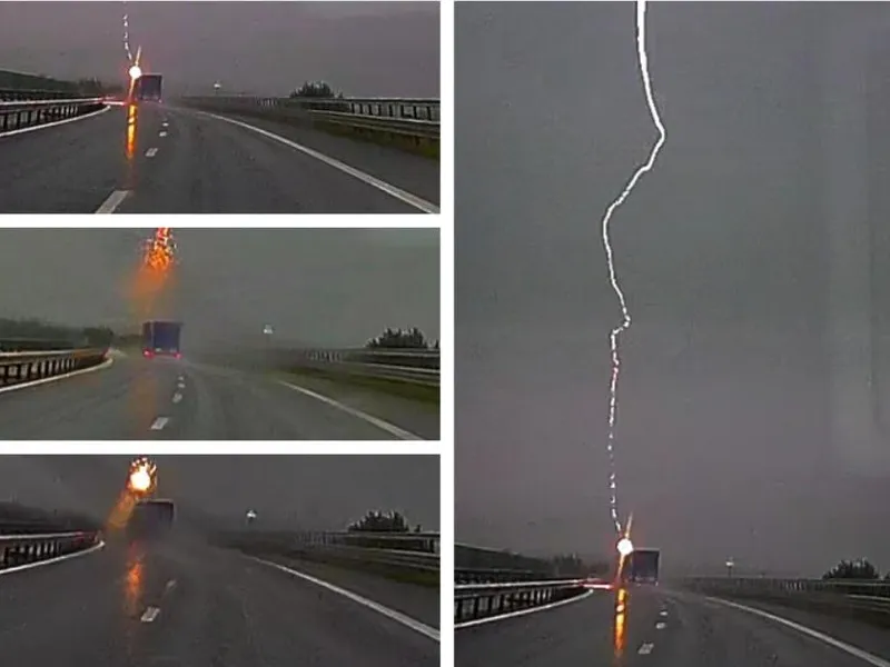 Imediat după incident, TIR-ul a tras pe dreapta, iar şoferul a coborât să inspecteze maşina. Acesta a luat în calcul cel mai pesimist scenariu, acela în care fulgerul i-ar fi aprins marfa pe care o transporta, potrivit observatornews.ro.