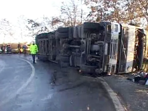Şoferul unui TIR ce transporta 200 de porci a fost grav rănit după ce autovehiculul s-a răsturnat pe DN 7, la Câineni, potrivit reprezentanţilor Inspectoratului de Poliţie Judeţean (IPJ) Vâlcea.