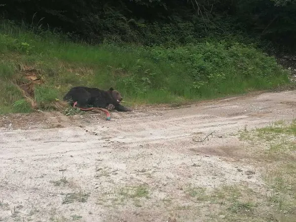 Potrivit unui comunicat al Inspectoratului de Jandarmi Judeţean Gorj, vineri, un jandarm aflat în timpul liber a observat un urs prins într-un cablu, în apropierea caselor din satul Crasna din Deal.