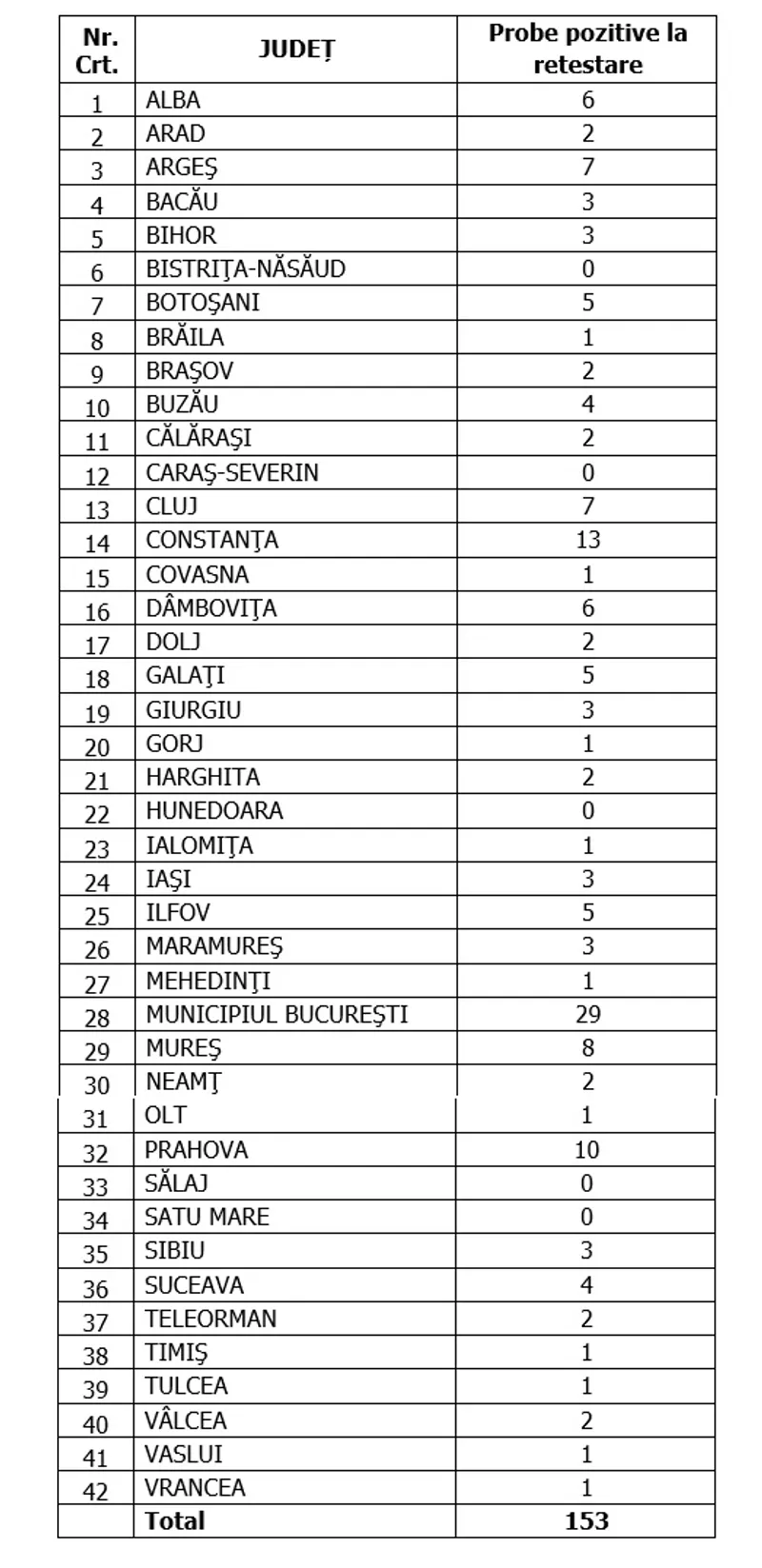 Distinct de cazurile nou confirmate, în urma retestării pacienților care erau deja pozitivi, 153 de persoane au fost reconfirmate pozitiv.