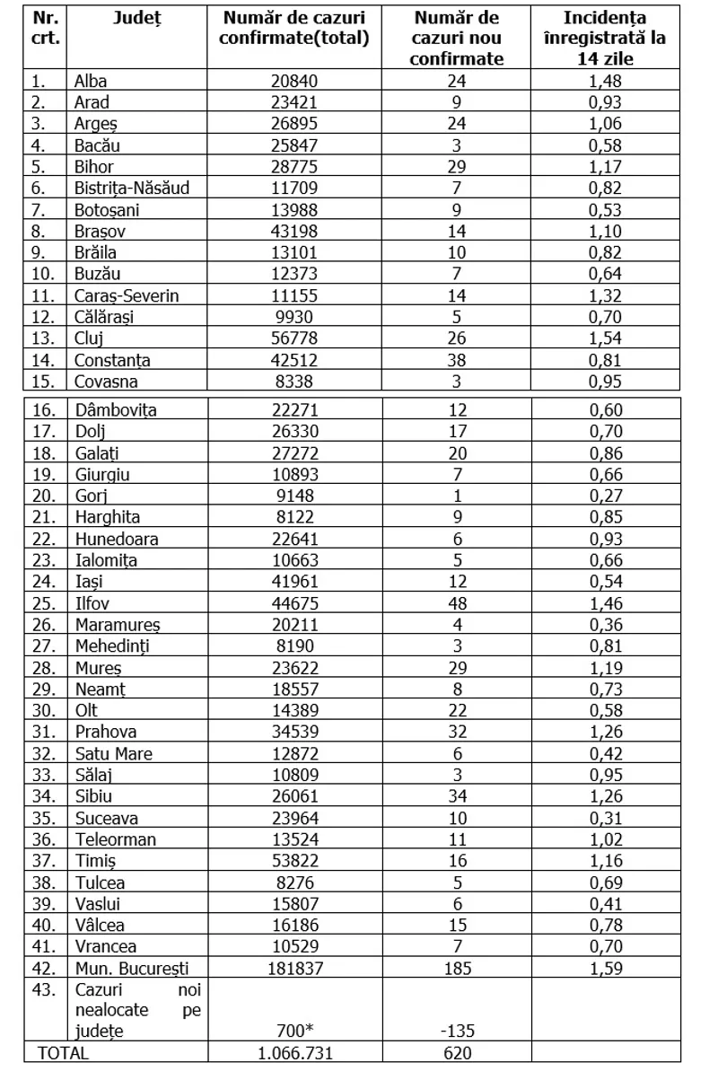 În urma testelor efectuate la nivel național, față de ultima raportare, au fost înregistrate 620 cazuri noi de persoane infectate cu SARS – CoV – 2 (COVID – 19), acestea fiind cazuri care nu au mai avut anterior un test pozitiv.
