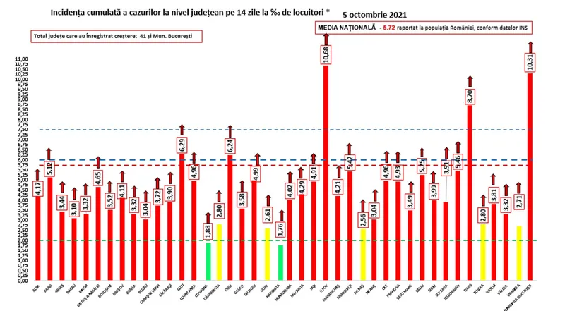 Coeficientul infectărilor cumulate la 14 zile, raportate la 1.000 de locuitori este calculat de către Direcțiile de Sănătate Publică, la nivelul Municipiului București și al județelor. Mai jos aveți graficul realizat în baza raportărilor primite de CNCCI de la Direcțiile de Sănătate Publică: