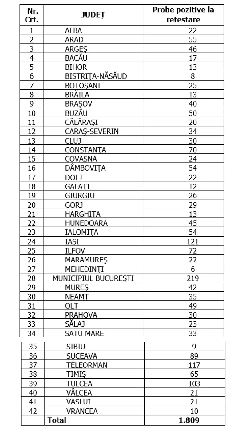 Distinct de cazurile nou confirmate, în urma retestării pacienților care erau deja pozitivi, 1.809 persoane au fost reconfirmate pozitiv. Distribuția pe județe a acestor cazuri o regăsiți în tabelul de mai jos: