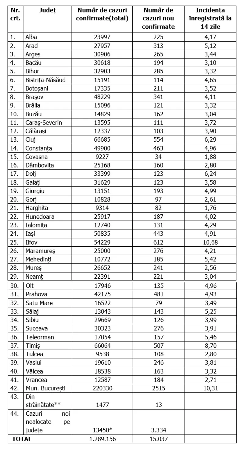 În total, în România au fost înregistrate 1.289.156 de cazuri de infectare cu coronavirus, dintre care 2.578 sunt ale unor pacienți reinfectați, testați pozitiv la o perioadă mai mare de 180 de zile după prima infectare.