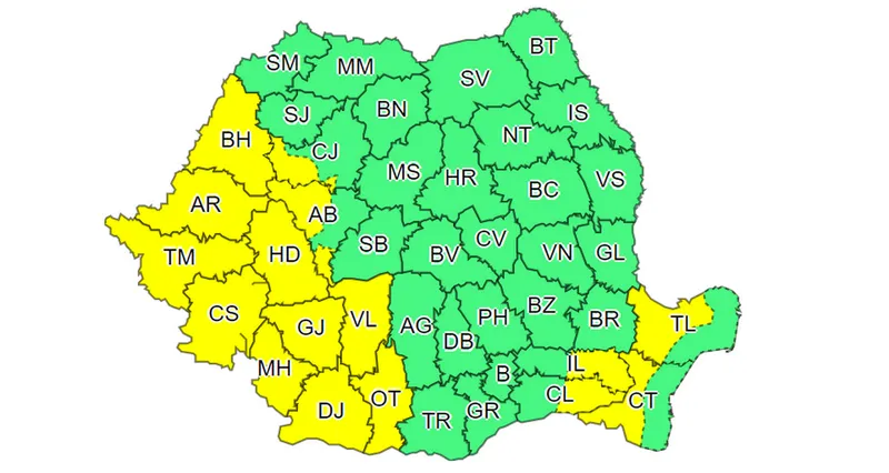 Pe lista judeţelor atenţionate cu Cod galben se află: Tulcea, Constanţa, Ialomiţa, Călăraşi, Olt, Vâlcea, Gorj, Dolj, Mehedinţi, Caraş-Severin, Hunedoara, Alba, Cluj, Timiş, Arad şi Bihor.