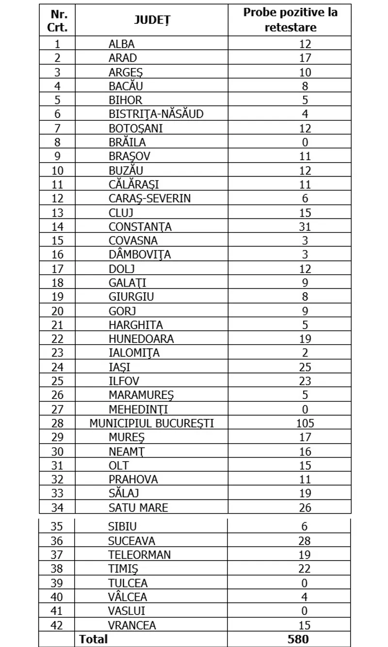 Distinct de cazurile nou confirmate, în urma retestării pacienților care erau deja pozitivi, 580 de persoane au fost reconfirmate pozitiv. Distribuția pe județe a acestor cazuri o regăsiți în tabelul de mai jos: