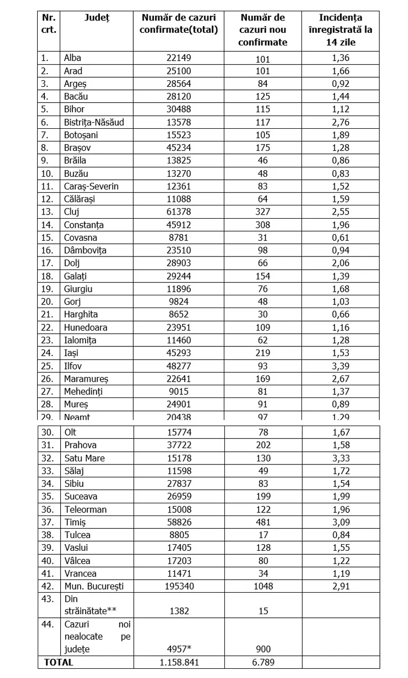 Până astăzi, 21 septembrie, pe teritoriul României au fost înregistrate 1.158.841 de cazuri de infectare cu noul coronavirus (COVID – 19), iar 35.721 de pacienți confirmați pozitiv au murit.
