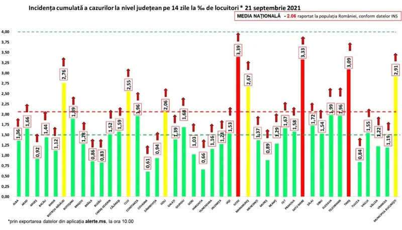 Coeficientul infectărilor cumulate la 14 zile, raportate la 1.000 de locuitori este calculat de către Direcțiile de Sănătate Publică, la nivelul Municipiului București și al județelor. Mai jos aveți graficul realizat în baza raportărilor primite de CNCCI de la Direcțiile de Sănătate Publică: