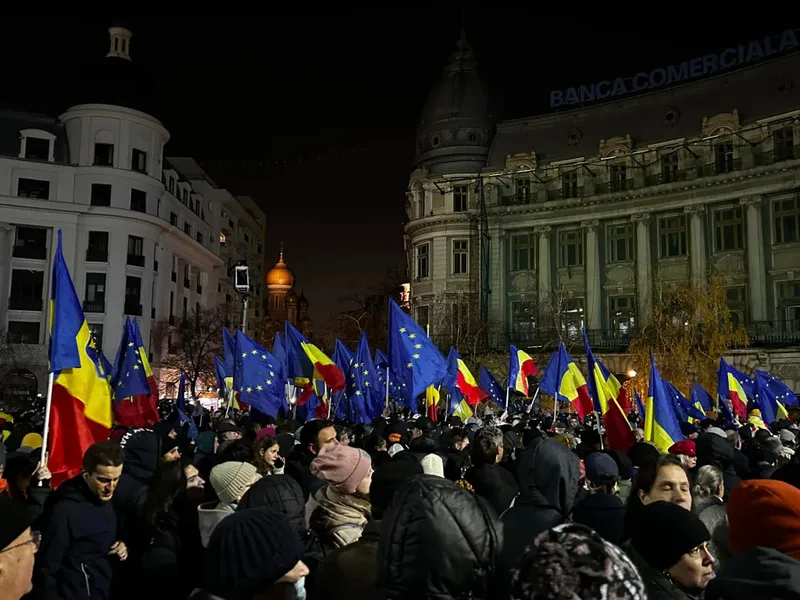 Câteva mii de oameni s-au strâns la Piața Universității cu steaguri ale României și ale UE.