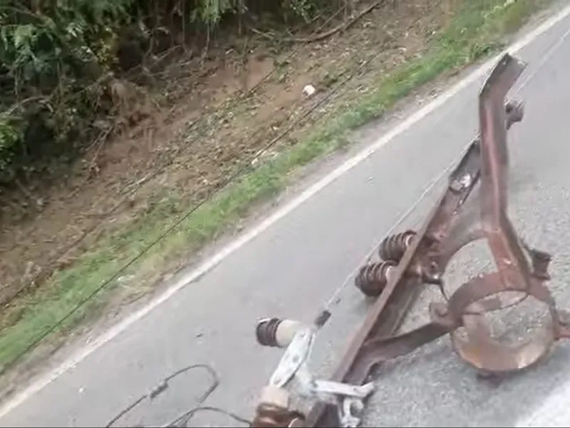În urma unui accident rutier, un TIR a strâmbat un stâlp de electricitate feroviar, la ieșirea din Călimănești. A trecut trenul, a agățat stâlpul și i-a doborât, în serie, pe următorii, rănind șapte martori oculari.