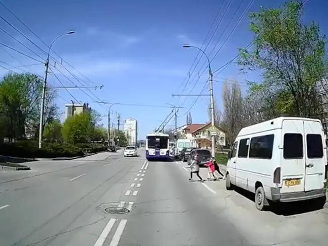 Trei copii au pornit brusc să traverseze strada, într-un loc neregulamentar, fără o minimă asigurare. Aceştia au apărut brusc în faţa maşinii care avea camera de bord şi au traversat în fugă. Din sens opus venea o altă mașină.