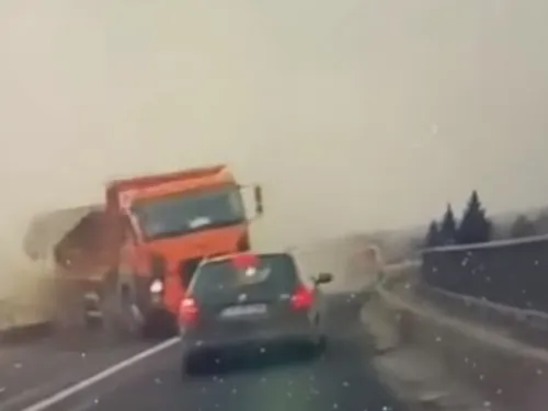Potrivit unor martori, șoferul basculantei ar fi pierdut controlul acesteia după mastodontului i-ar fi explodat o roată de pe față.