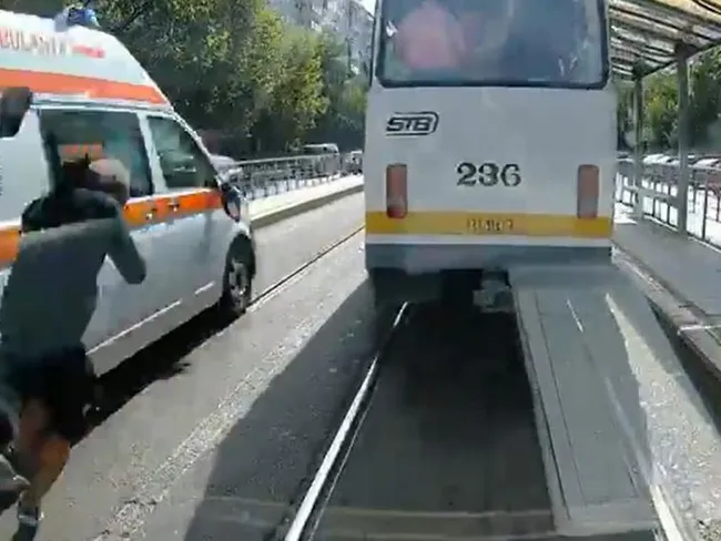 Nu traversați niciodată printre două vehicule mari, care nu vă permit să vă asigurați! A încercat un bărbat în București. A traversat printre două tramvaie oprite în stație și a fost lovit de o ambulanță aparent în misiune.