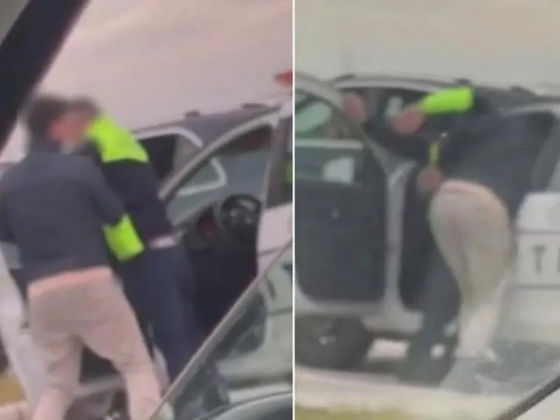 Un echipaj al Poliției Autostrăzi a oprit un SUV Mercedes care dădea flash-uri și mergea periculos. Supărat că a fost tras pe dreapta, șoferul a devenit agresiv cu polițiștii, împingându-l chiar pe unul dintre agenți și intrând peste acesta în autospecială pentru a-și lua actele.