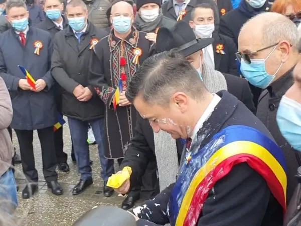 VIDEO Chirica, primarul Iașiului, a fost mânjit cu iaurt de Ziua Unirii Principatelor de un cetățean