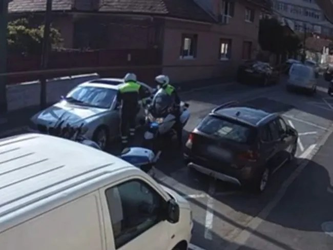 Poliţiştii au plecat în urmărirea unui şofer care a refuzat să oprească la semnalele de oprire şi a fugit, lovind în calea sa două maşini. BMW-ul său a fost blocat pe o stradă, iar doi polițiști pe motociclete au intervenit.