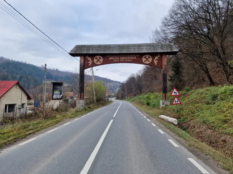 La intrarea în Roșia Montană te întâmpină o poartă mare de lemn inscripționată cu Noroc Bun, care capătă accente ironice când privești la pensionarul- jucător.