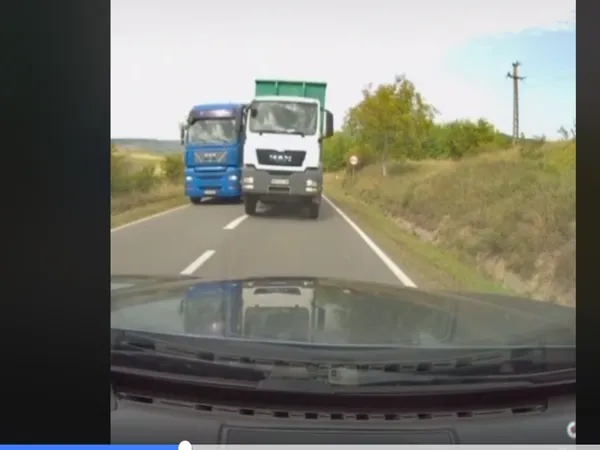 În video-ul postat pe pagina Secția de Poliție se vede cum șoferul care a făcut filmarea a avut inspirația să oprească văzând cum, din față, un șofer de camion depășește un alt camion.