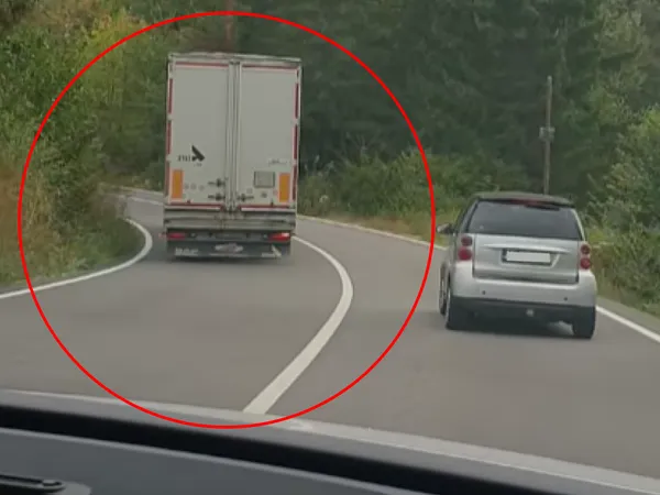Imaginile surprinse de o cameră de bord arată cum camionul depășește un autoturism, încălcând linia continuă și întrând într-o curbă periculoasă la stânga, fără să țină cont de posibilitatea unui vehicul care ar putea veni din sens opus.