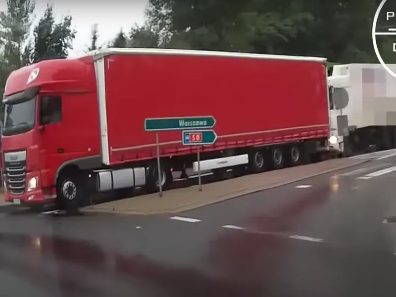 Un accident de necrezut s-a produs în Polonia, între două camioane DAF, la o intersecţie cu sens giratoriu din apropiere de orăşelului Boleslawiec. Cel mai revoltător lucru e că şoferul, care a provocat accidentul, lua masa pe un platou în timpul condusului, mai privind şi filme în acest timp.