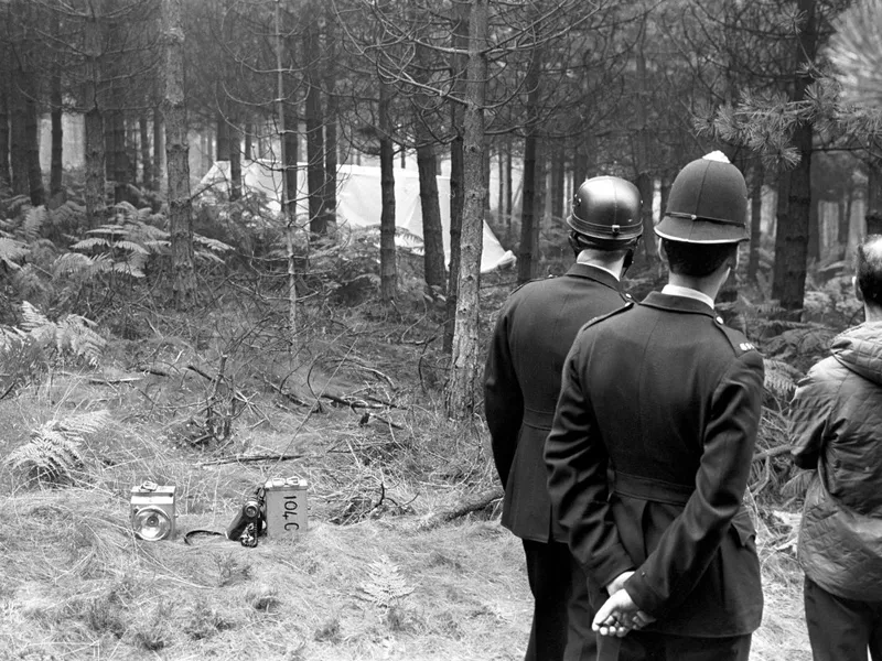 Imaginea arată o pată mare în mijlocul unei păduri din Cannock Chase, Staffordshire, un loc în care a acționat un ucigaș în serie, Raymond Leslie Morris din anii 1960.