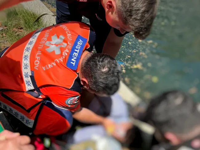 O femeie înecată în râul Dâmbovița, în zona centrală a Capitalei, a fost salvată ca-n filme. Un trecător a făcut semne disperate echipajului unei ambulanțe aflate în misiune, un șofer a oprit, a sărit în apă și a scos-o. Ajunge și un paramedic pe motocicletă, începe resuscitarea.