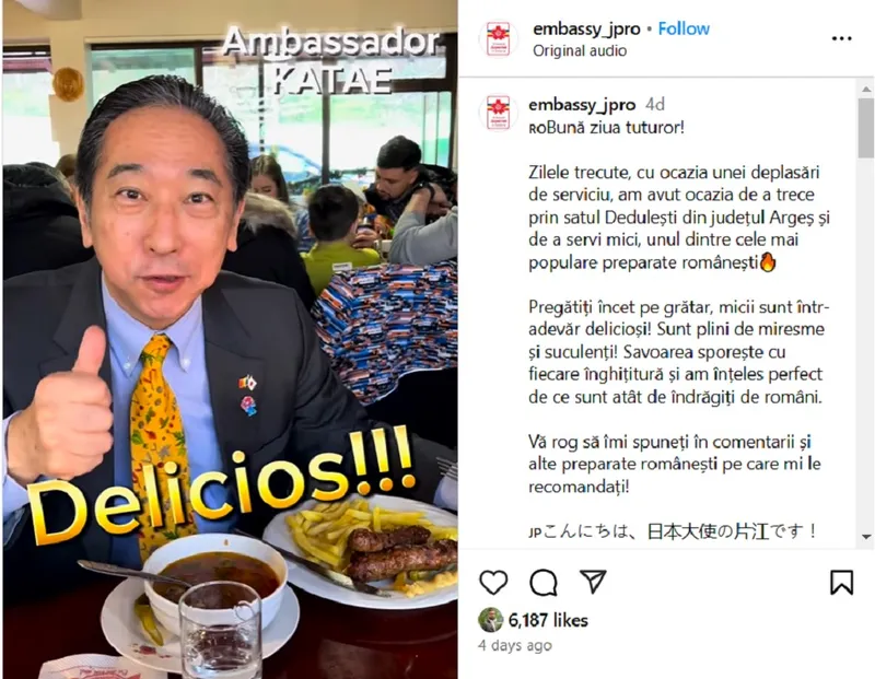 Pe contul de Instagram al Ambasadei Japoniei la București a fost postat recent un filmuleț în care apare ambasadorul Japoniei mâncând mici la Dedulești.