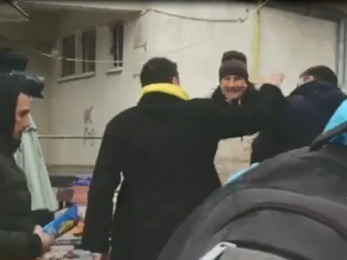 După doar câteva minute cameramanul din coloana AUR a repetat gestul în sectorul de comercializare dinspre Biserica Sfântul Gheorghe, unde a lovit cu palma peste cap o botoșăneancă, nemulțumit probabil pentru că i-a intrat în cadru.