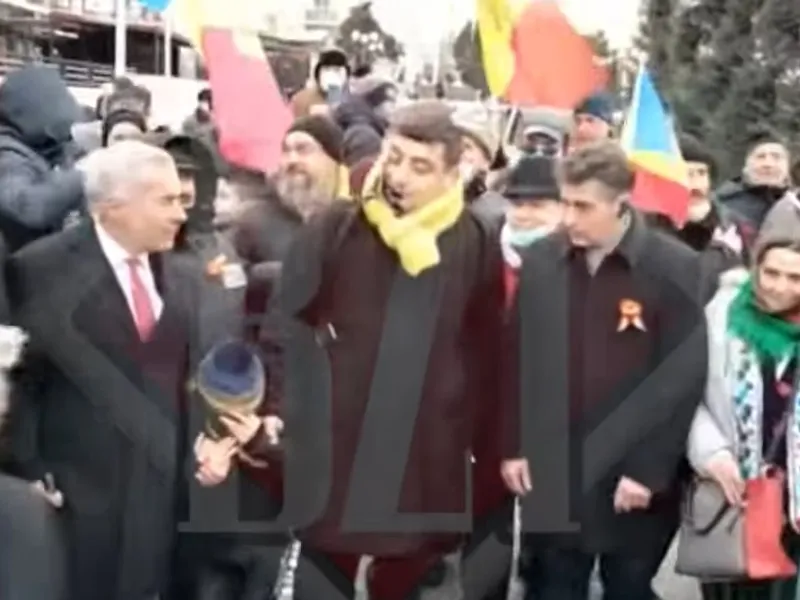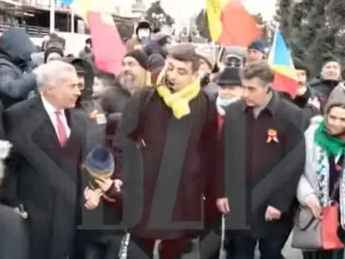Liderul AUR tocmai intrase într-o horă, în Piața Unirii din Iași. Potrivit unei înregistrări video publicate de bzi.ro, un participant l-a stropit cu cerneală albastră pe Simion, care se afla în marș alături de simpatizanții AUR.