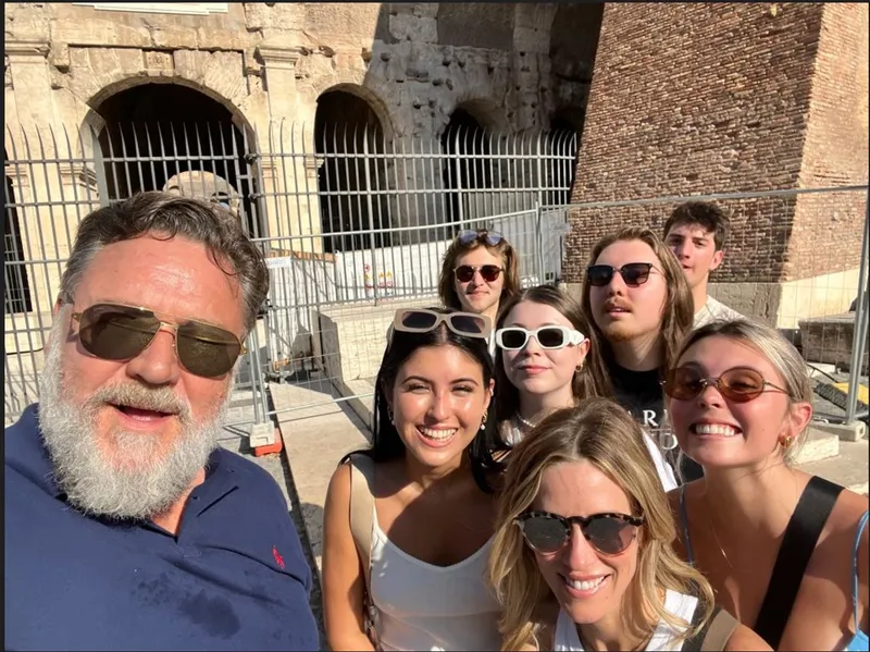 Russell și-a amuzat fanii nostalgici atunci când a dezvăluit că și-a dus familia la "vechiul său birou" - Colosseum din Roma, locul în care au avut loc multe dintre scenele iconice ale filmului - și a împărtășit o fotografie.