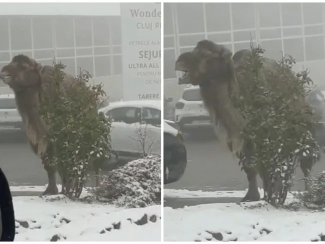 VIDEO Imagini virale: Cum a ajuns o cămilă să mănânce tufișuri pe străzile din Cluj